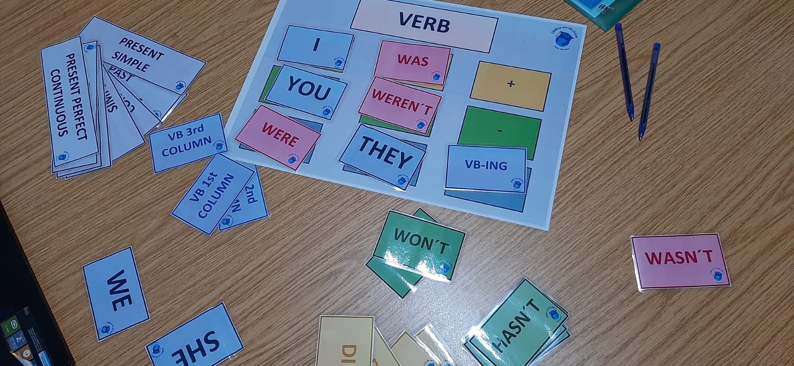 16 tarjetas con nombres de los diferentes tiempos verbales / Tablero A3 y 40 tarjetas pequeñas para poder elaborar los diferentes tiempos verbales con los diferentes auxiliares, sujetos y conjugación del verbo